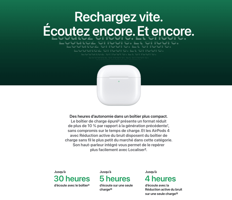 - Boîtier de Charge Compact : Plus petit de 10%, il offre jusqu’à 30 heures d’autonomie totale.